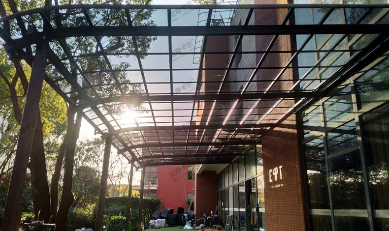 頂部用的是2.0mm聚碳酸酯板材,透光性能好(透光率88%)在陽(yáng)光下曝曬不會(huì)產(chǎn)生黃變、霉化、透光不佳。表面有防紫外線的共擠層(uv涂成),可防止太陽(yáng)紫外線引起的樹(shù)脂疲勞變黃。表面共擠層具有化學(xué)吸收紫外線并轉(zhuǎn)化為可見(jiàn)光。對(duì)植物光合作用有良好的穩(wěn)定效果,極適合保護(hù)汽車使其免受紫外線破壞。